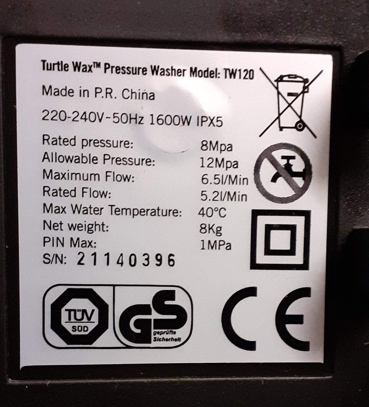 Hose compatible with Turtlewax TW120 high-pressure washers.